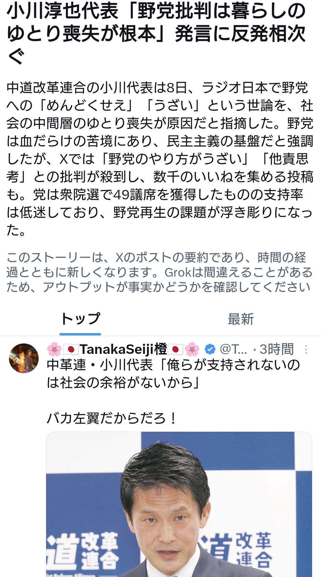 中道・小川代表「中道が支持されないのは有権者の余裕が無いからだ」 ←批判相次ぐ