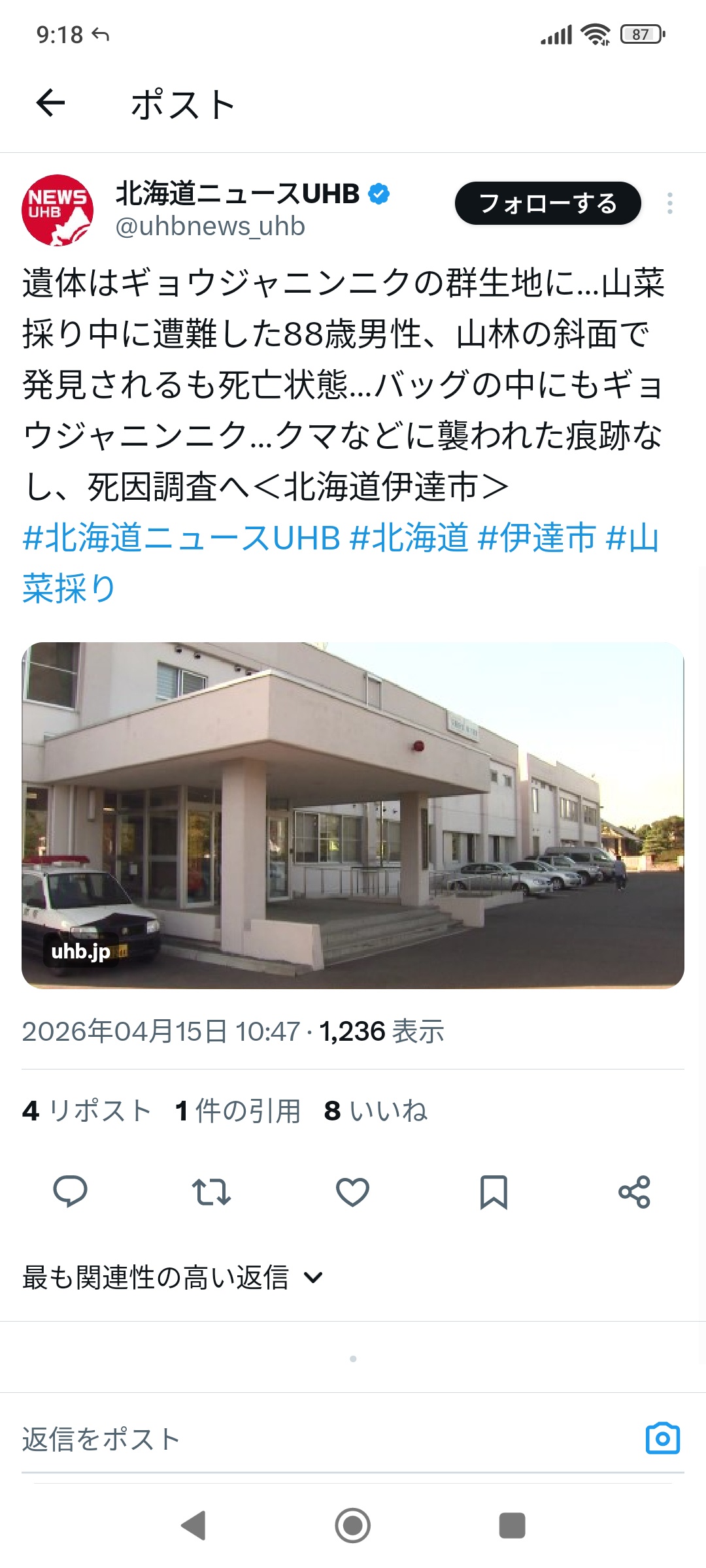 - 北海道のニンニク群生地で男性死亡
