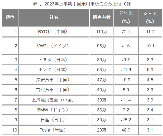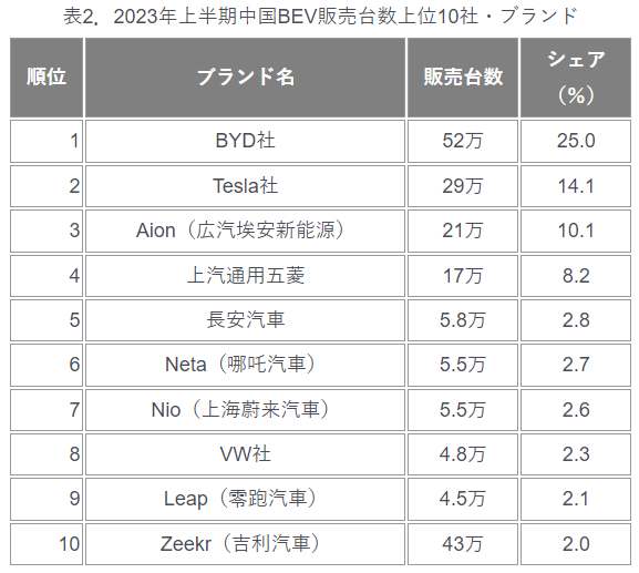 2023年上半期中国BEV販売台数上位10社・ブランド