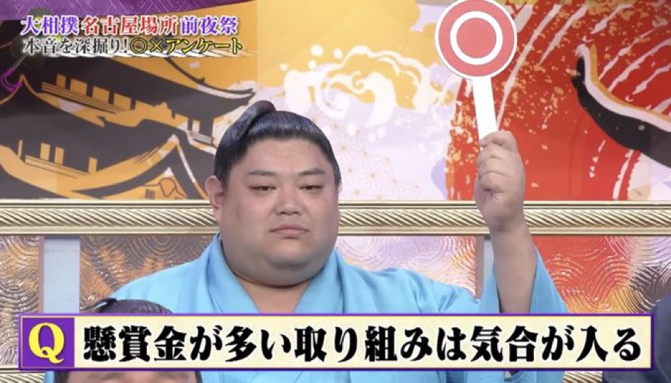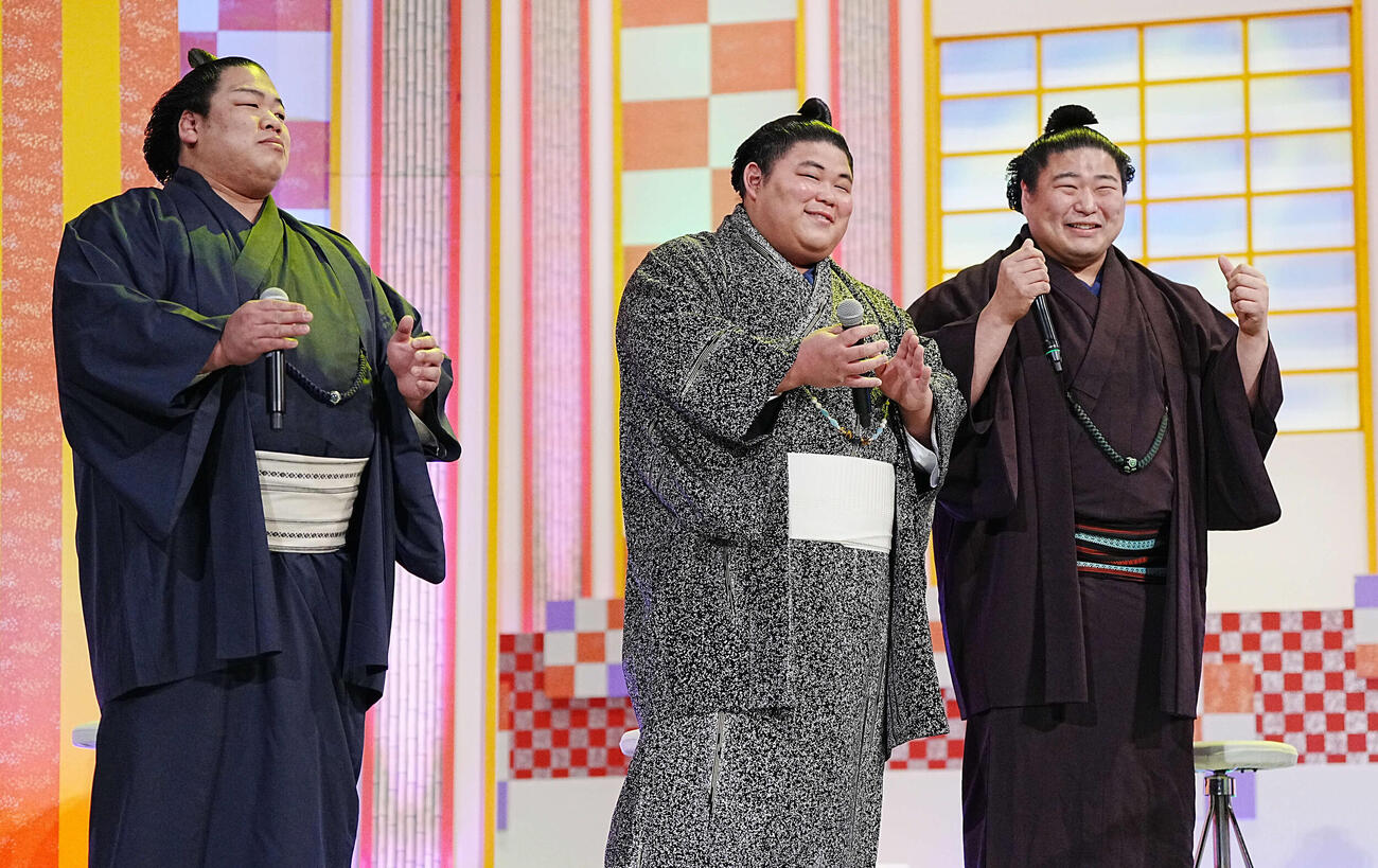 写真=「お楽しみ歌くらべ」で熱唱する熱海富士を見守る、左から平戸海、伯乃富士、若元春