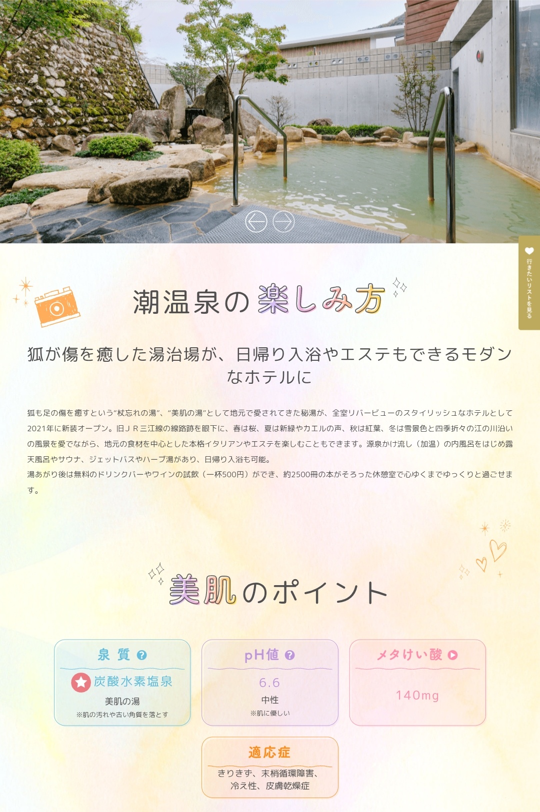 泉質に美肌成分(メタケイ酸)や古い角質を落とす「重曹泉」の特性を持ち、