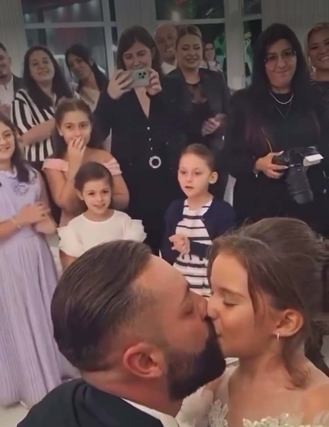 事実: 父親が娘の祝いの席でキスをしている(現地の文化では許容される家族愛)。