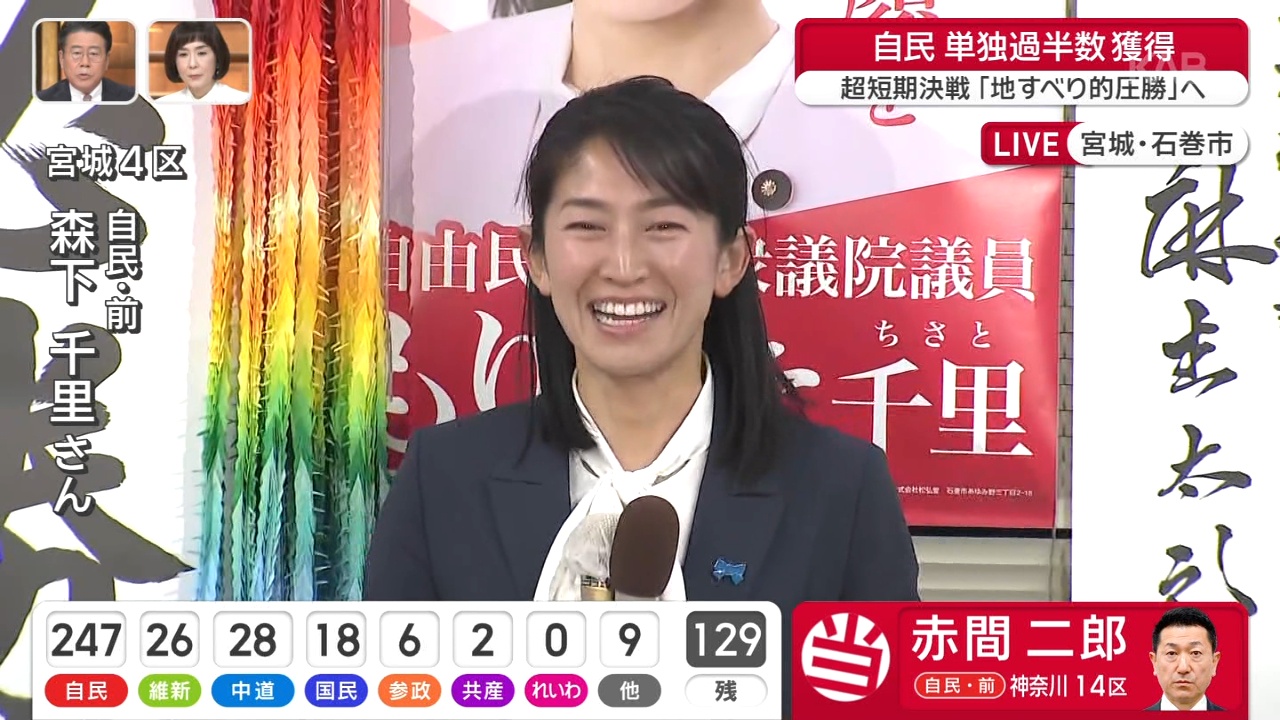 【超速報】宮城四区森下が当確!!!!!!!(´・ω・`)