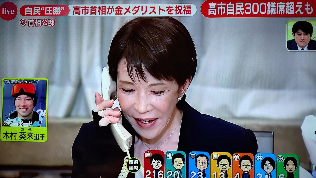 【悲報】日曜討論から逃げた高市さん、選挙特番でTV局からの中継が来るタイミングでわざわざオリンピック金メダリストに電話をかけ始めてしまう