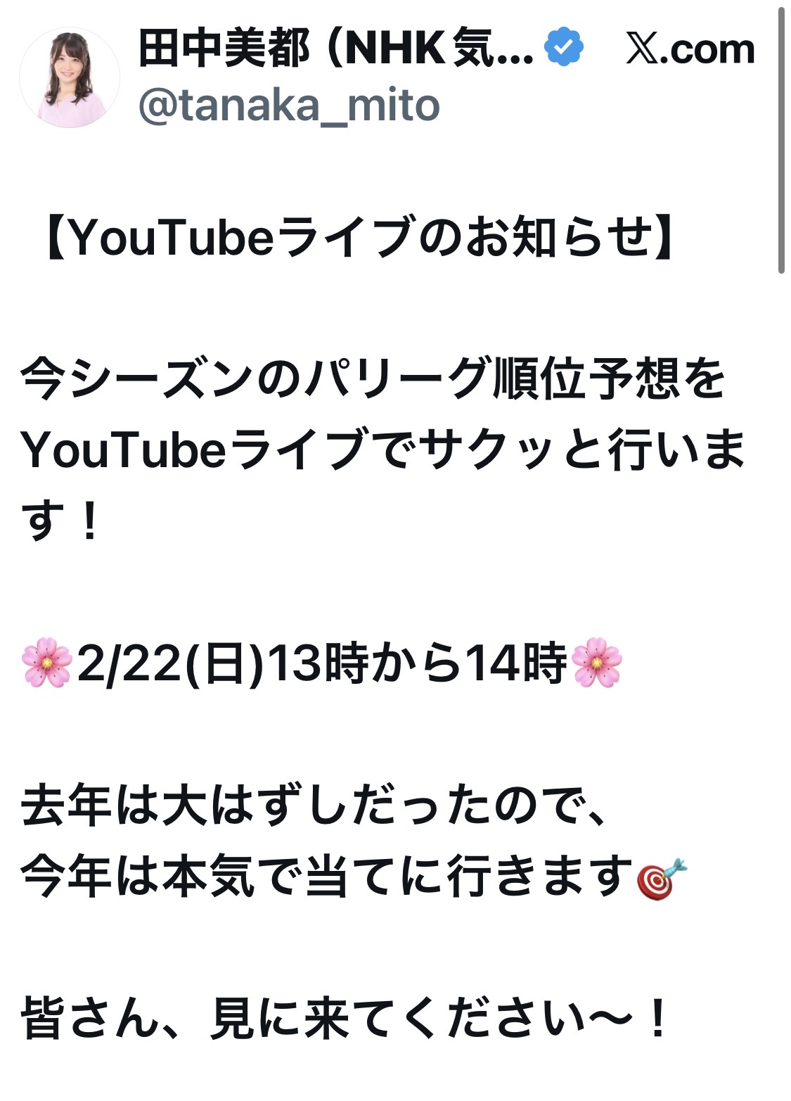 - 田中美都(NHK気象予報士)