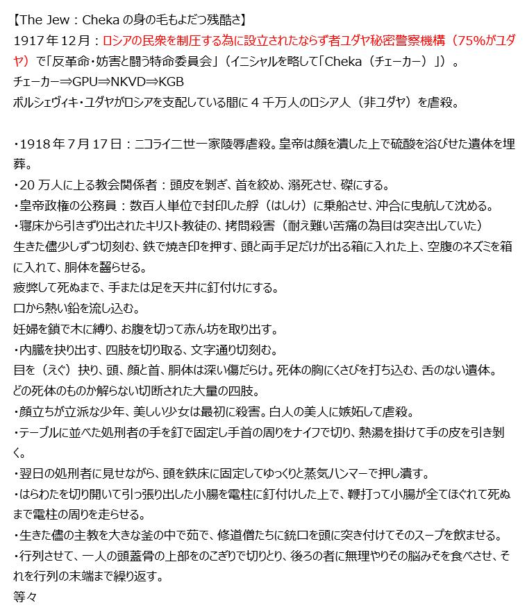 欧州での共産主義に対抗する闘争は、全て同じ類型であった。つまり、それぞれ、個々の國の國家主義勢力が、ソ連の共産主義インターナショナル(コミンテルン)に支払われ、支援された猶太人共産主義者によって指導・扇動された革命勢力に対抗するものであった。そしてソ連自身が猶太人の組織なのであった。共産主義インターナショナルの目的が世界征服であったことは、その記録に明白であり、そこでは次の様に宣言している。