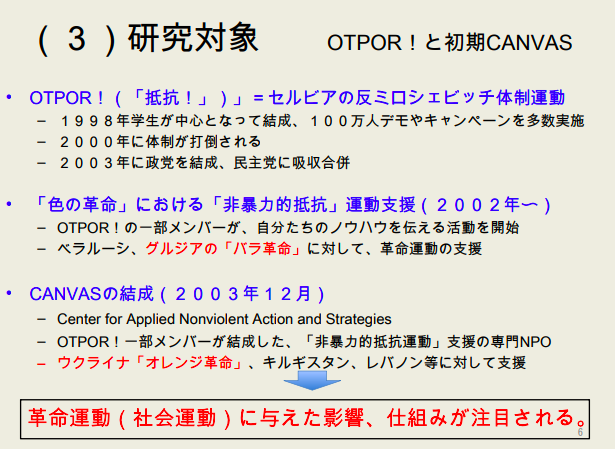その後、オトポールはユーゴスラビアの民主党に吸収されるが、残った活動家が東欧を中心に自分たちの革命のノウハウを布教する活動を開始しCANVAS(Center for Applied Nonviolent and Strategies)を結成、