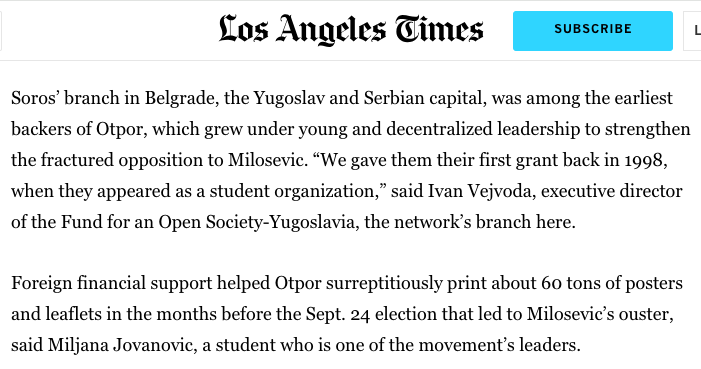 ジョージ・ソロスのオープンソサエティ財団が世界中の”民主化革命"を作っているとは良く言われるが、その出発点は彼の出身国ハンガリーの隣、ユーゴスラビアで1998年に始まった反体制運動を支援した事に始まる。その団体名はオトポール。シンボルとなった拳のマークは共産主義運動で定番的に使われていたもので、BLM運動やANTIFAなど、ソロスの運動方針をよく表している。