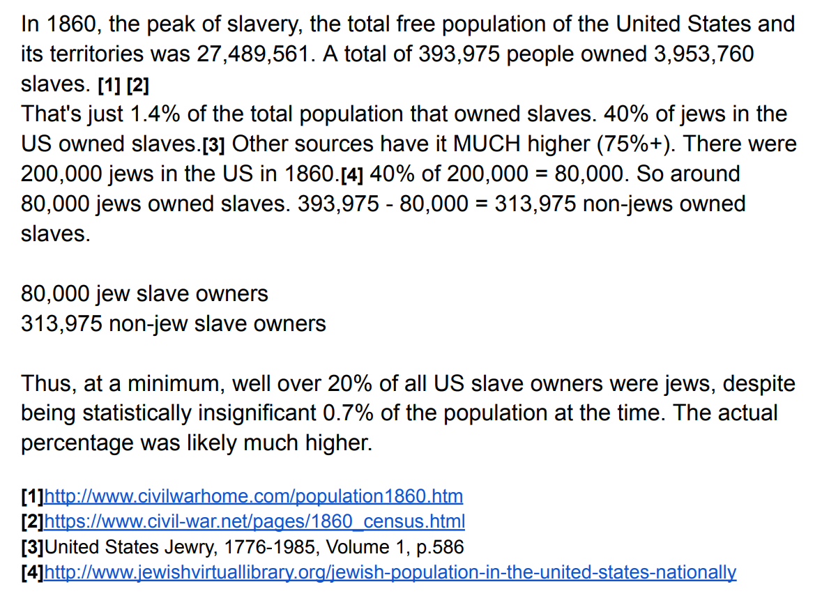 先の出典に基づけば、当時の人口の0.7%であったにもかかわらず、最低でもアメリカの奴隷所有者全体の20%以上がユダヤ人であったことになる。