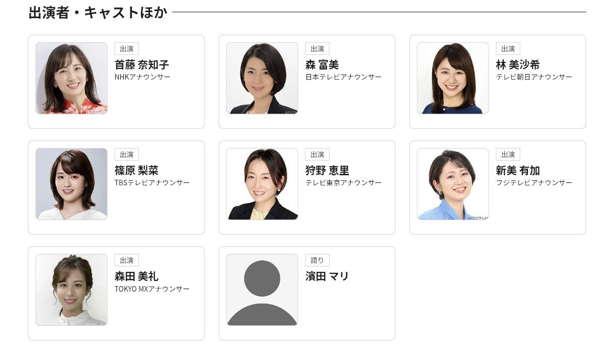 【司会】首藤奈知子,【出演】森富美,林美沙希,篠原梨菜,狩野恵里,新美有加,森田美礼,【語り】濱田マリ