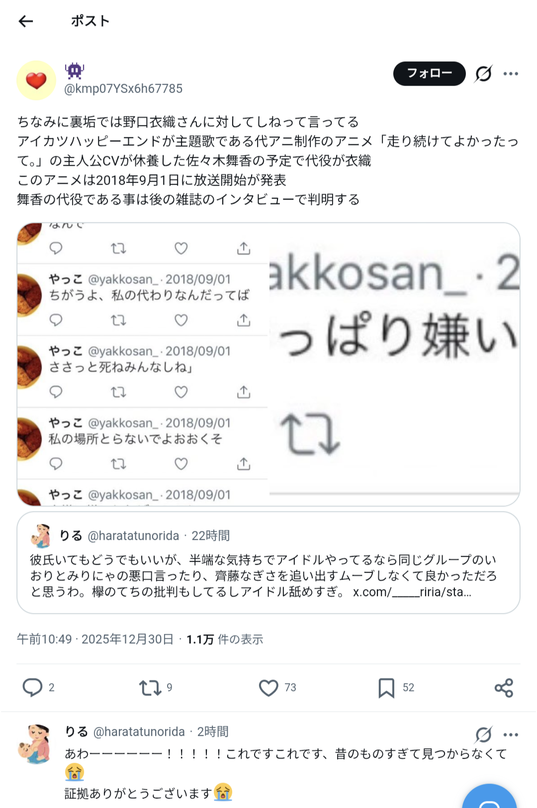 ちなみに裏垢では野口衣織さんに対してしねって言ってる