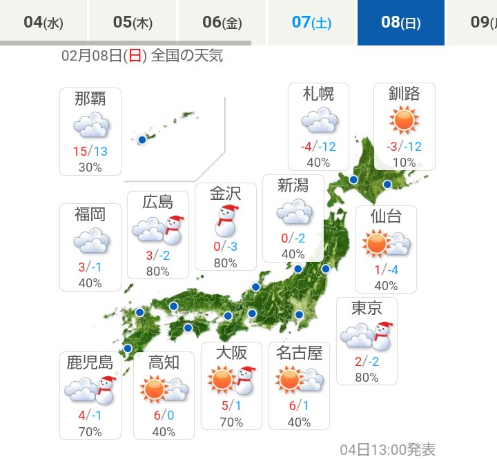 - 東京、大阪、広島、鹿児島が雪