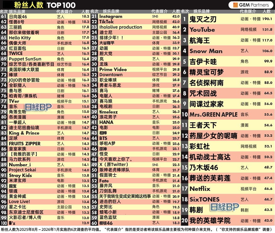 - ■日経エンタ エンタメコンテンツ推し活ファン人数ランキングトップ100最新