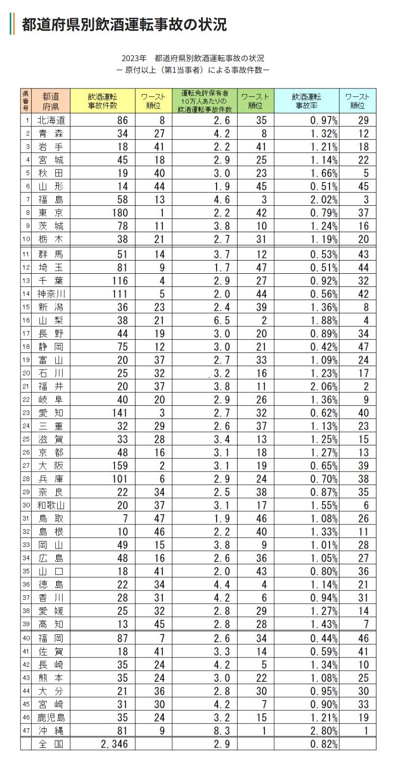 都道府県別飲酒運転事故の状況