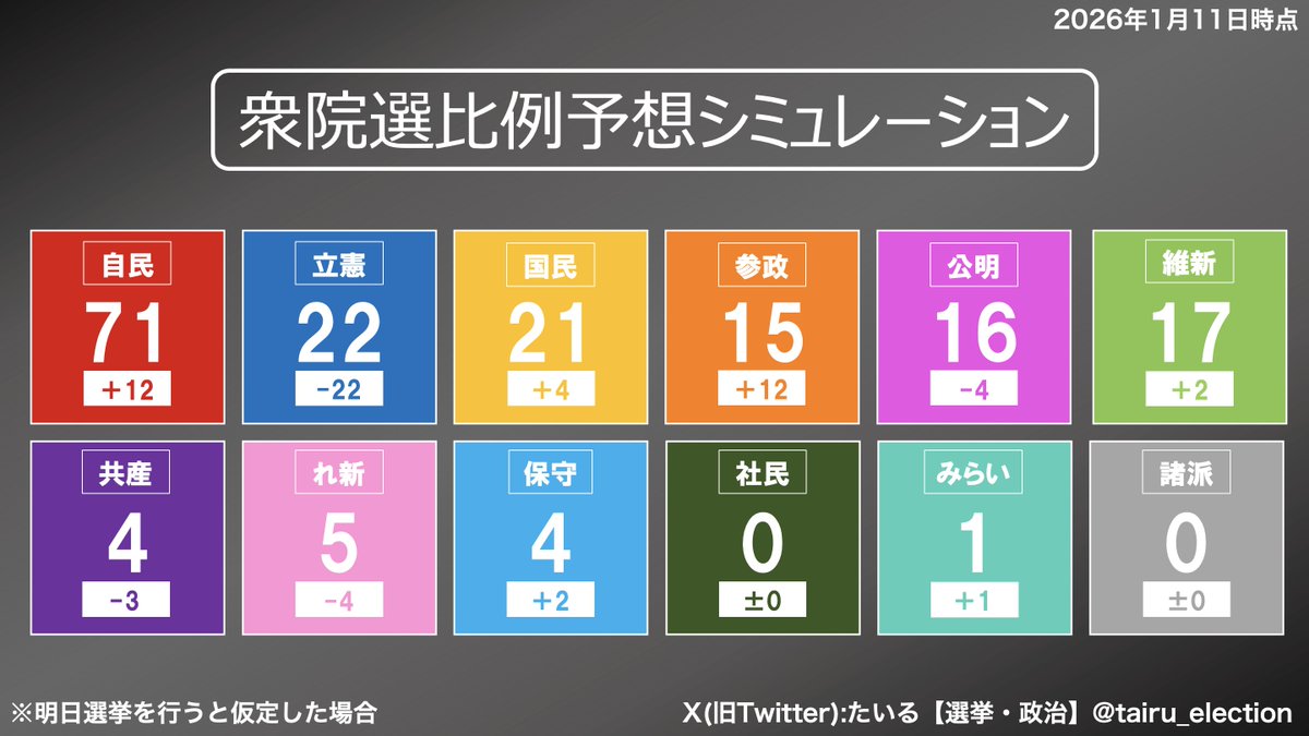 - 次期衆議院選挙 比例議席・票数シミュレーション(1/11時点)