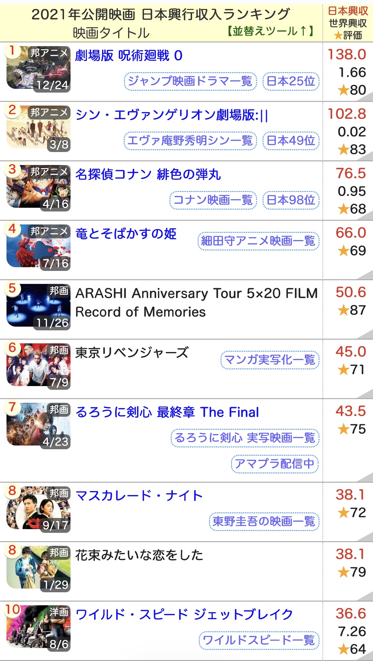 - シンエヴァ、100億超えても21年興収一位にはなれなかったのか、、、