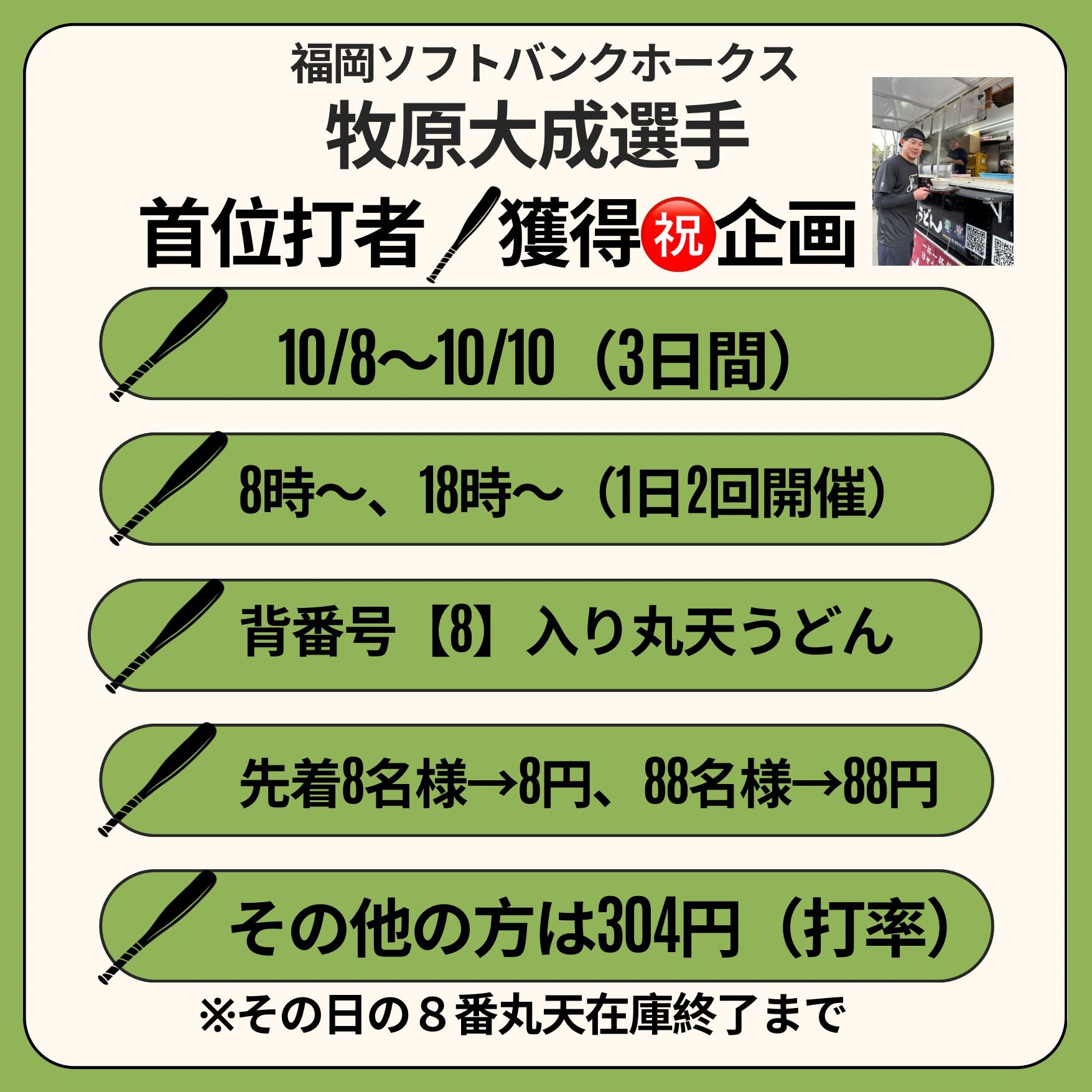 - 立花うどんは牧原の首位打者記念イベントやるのね