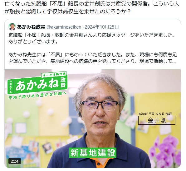 亡くなった抗議船「不屈」船長の金井創氏は共産党の関係者。