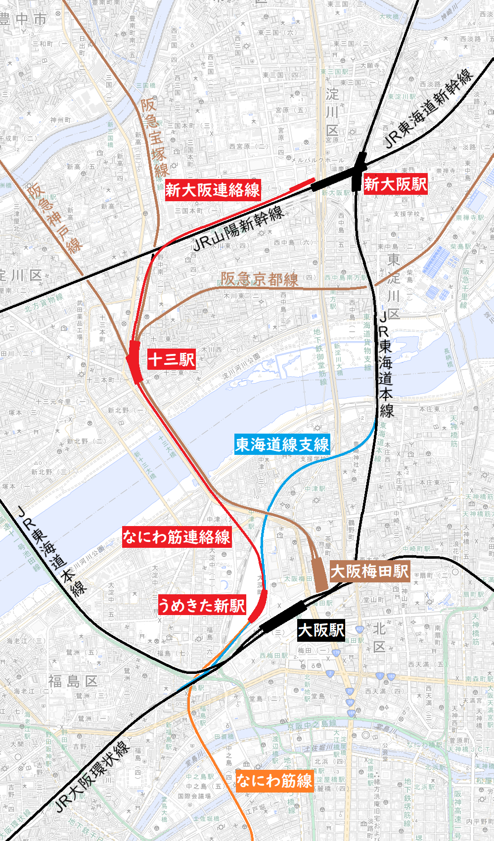 阪急電車から梅田へ向かって左に見える線路の跡地ってずっとつづいるけど
