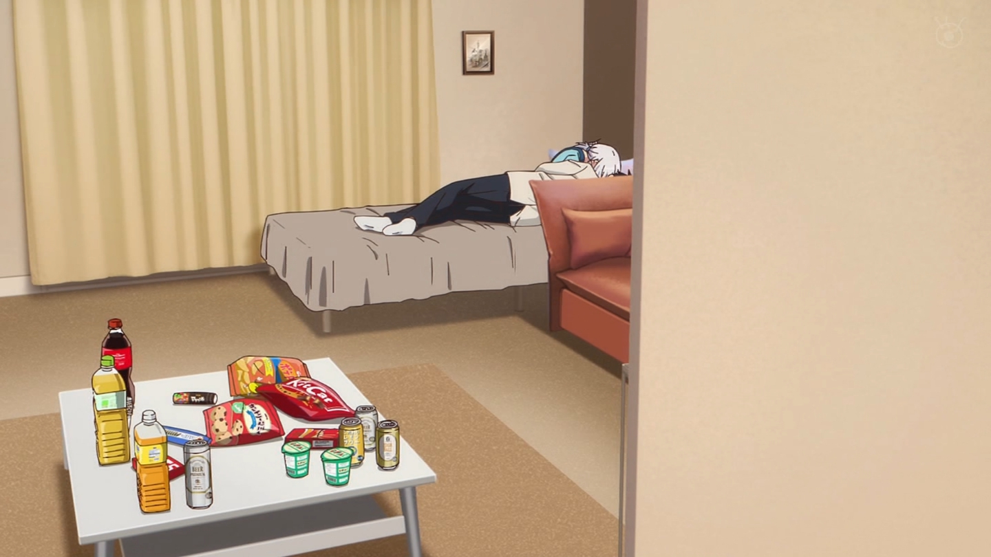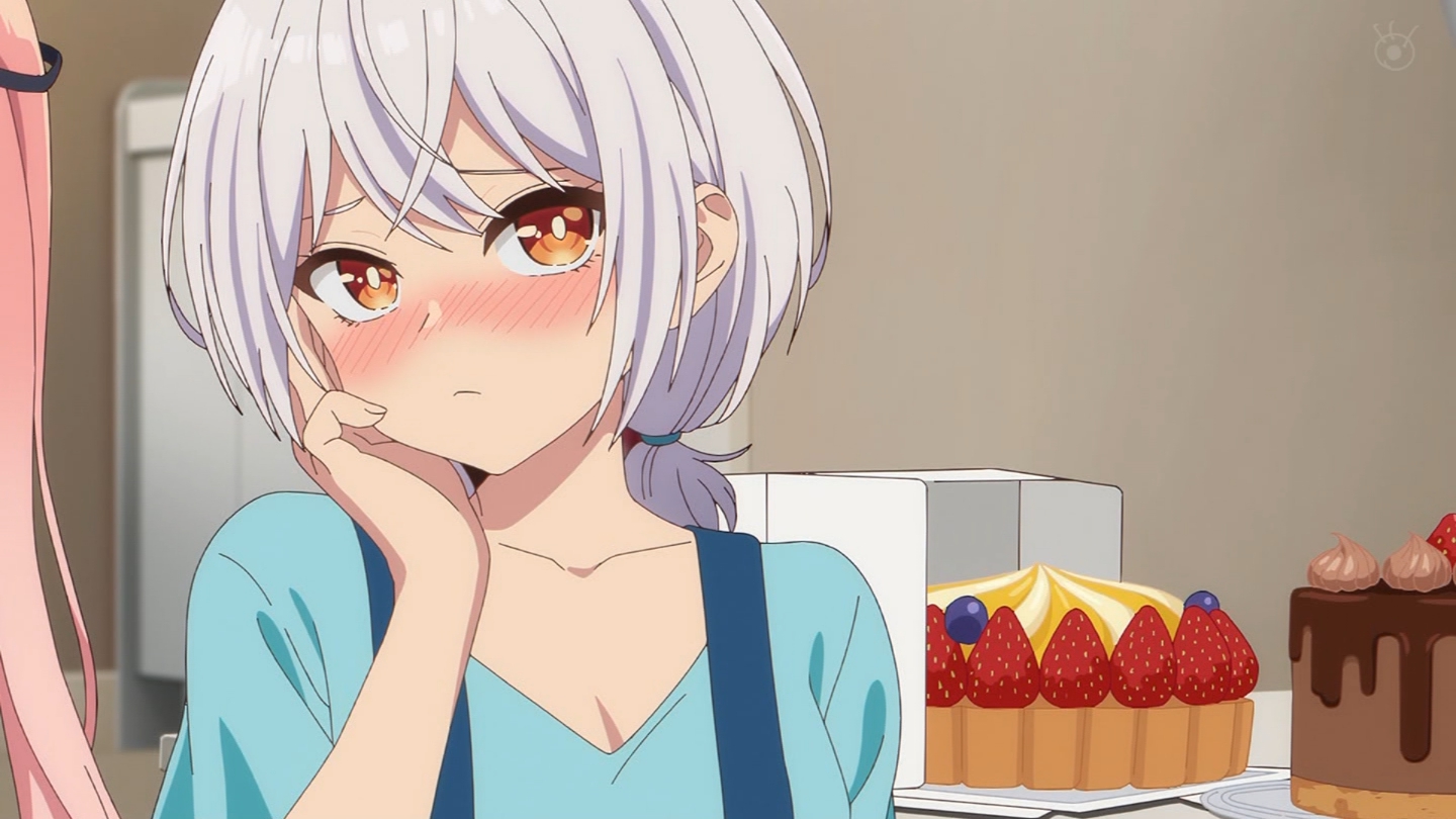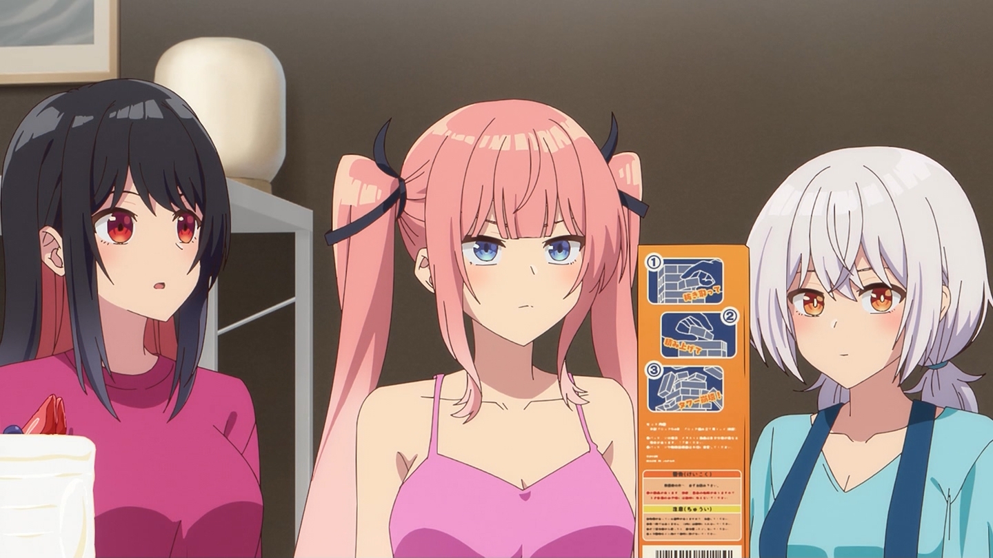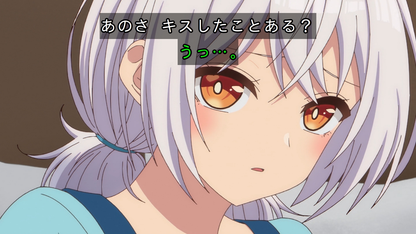 6話 無事に告白代行企画を成功させた放送部は、その晩、檸檬の自宅に集まっていた。『体育祭大成功★ハイパー打ち上げ』と称し、六花の音頭で乾杯する放送部員たち。各々めかしこみ気合いを入れてきたのだが、有栖は体育祭の疲労から、すぐに寝落ちしてしまう。一同は眠ってしまった有栖を放っておき、それぞれおすすめの食べ物を買ってくることになる。最初に部屋に戻ってきた霧乃イコは、