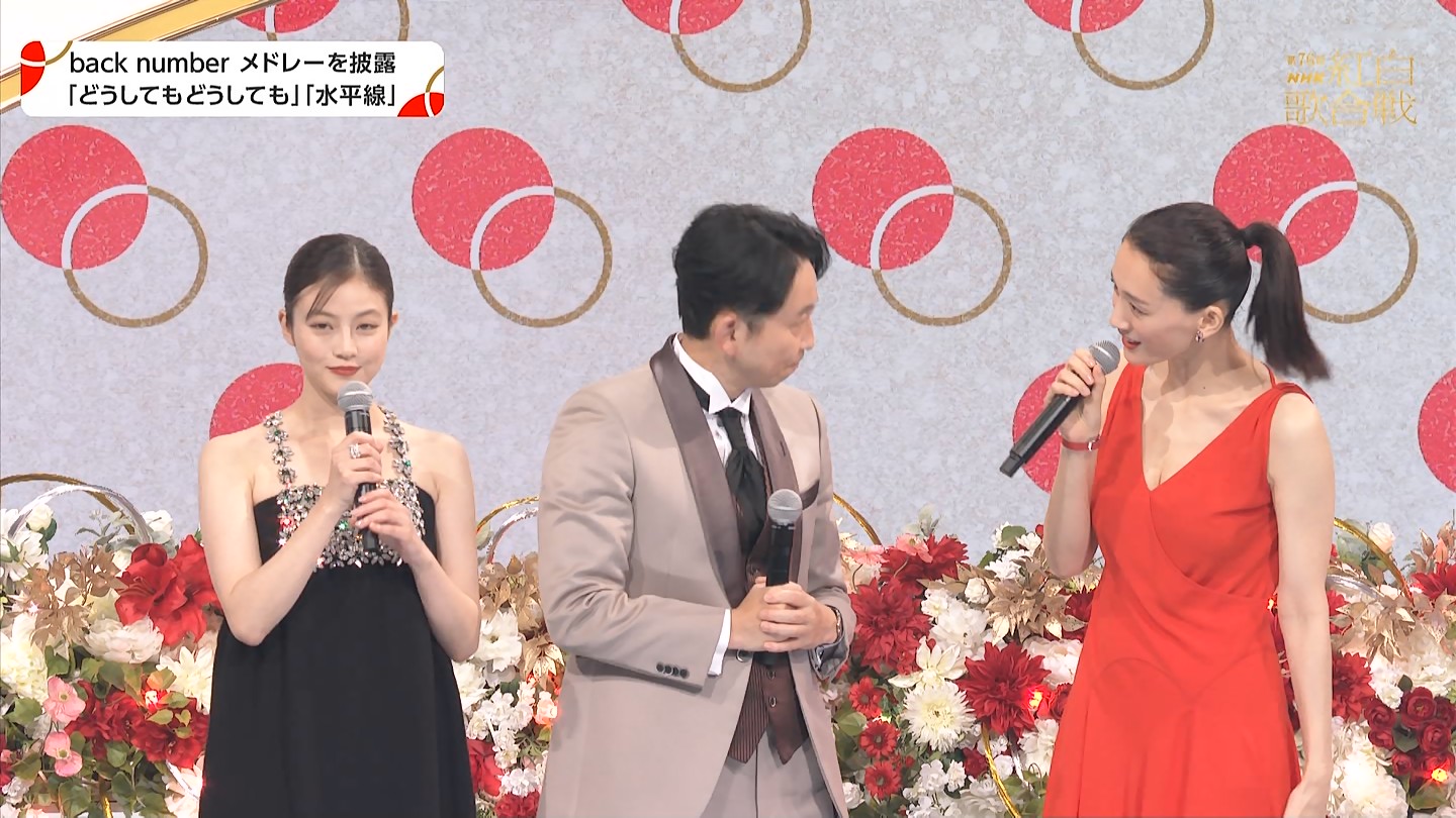 【司会】綾瀬はるか,有吉弘行,今田美桜,鈴木奈穂子,【出演】アイナ・ジ・エンド,あいみょん,ILLIT,幾田りら,石川さゆり,岩崎宏美,AKB48,aespa,&TEAM,ORANGE RANGE,CANDY TUNE,King & Prince,久保田利伸,郷ひろみ,サカナクション,坂本冬美,純烈,SixTONES,髙橋真梨子,ちゃんみな,TUBE,天童よしみ,Number_i,新浜レオン,乃木坂46,Vaundy,back number,HANA,Perfume,ハンバートハンバート,BE:FIRST,福山雅治,布施明,FRUITS ZIPPER,MISIA,水森かおり,Mrs.GREEN APPLE,三山ひろし,M!LK,米津玄師,RADWIMPS,LiSA,堺正章,玉置浩二,氷川きよし,星野源,松田聖子,松任谷由実,矢沢永吉,稲葉浩志,北村匠海,河合優実,原菜乃華,高橋文哉,大森元貴,津田健次郎,中尾隆聖,山寺宏一,戸田恵子,江口のりこ,西村雄正,ダイアン,Rockon Social Club,吉村崇,都倉俊一,