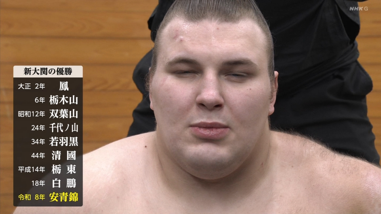 - 【相撲】初場所千秋楽 大関・安青錦が2場所連続優勝!! 新関脇、新大関で連続Vは1937年春場所の双葉山以来89年ぶり