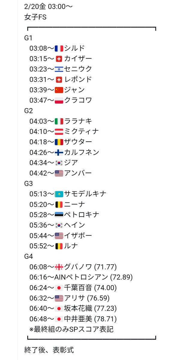 - ⏰2/20(金)03:00- 女子FS⛸🥇🥈🥉